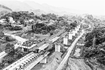 图为2月26日,在重庆市合川区清平镇的西渝高铁建设工地,架梁机在进行架梁作业(无人机照片)。